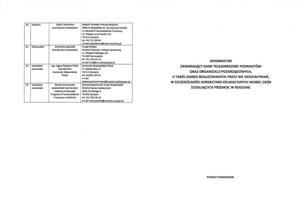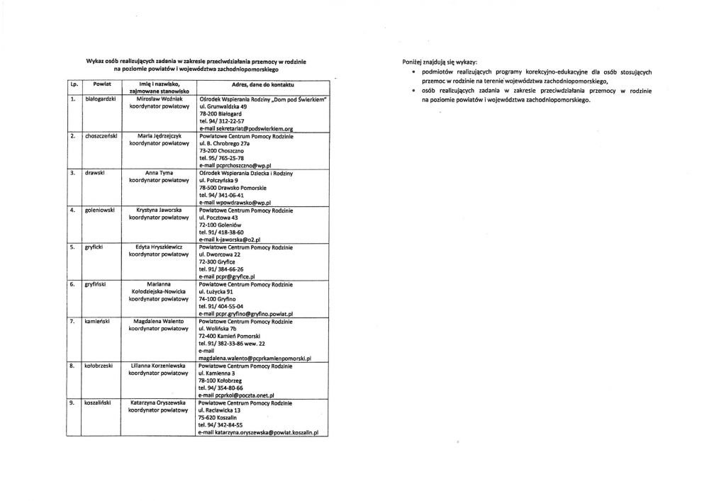 Wykaz osób realizujących zadania w zakresie przeciwdziałania przemocy w rodzinie na poziomie powiatów i województwa zachodniopomorskiego - strona 1 - JPG60 KB