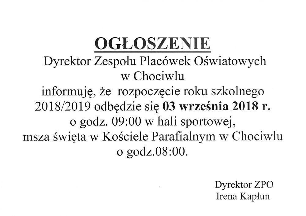 Dyrektor Zespołu Placówek Oświatowych w Chociwlu informuje o rozpoczeciu roku szkolnego.