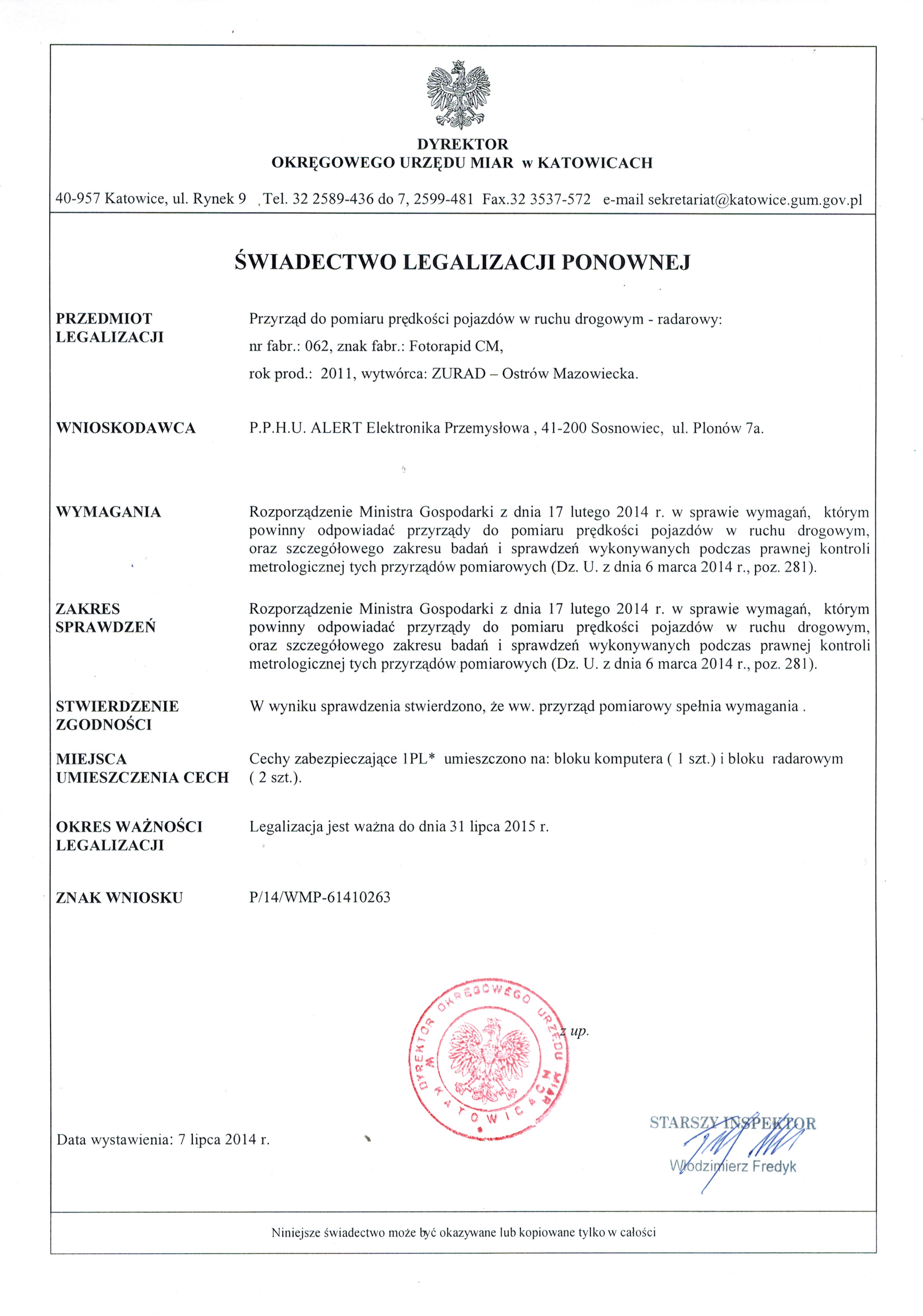 | 1 | legalizacja fotoradaru nr fabr. 062.jpg (JPG, 69KB) | 2014-09-17 09:07:39 | 247 razy |